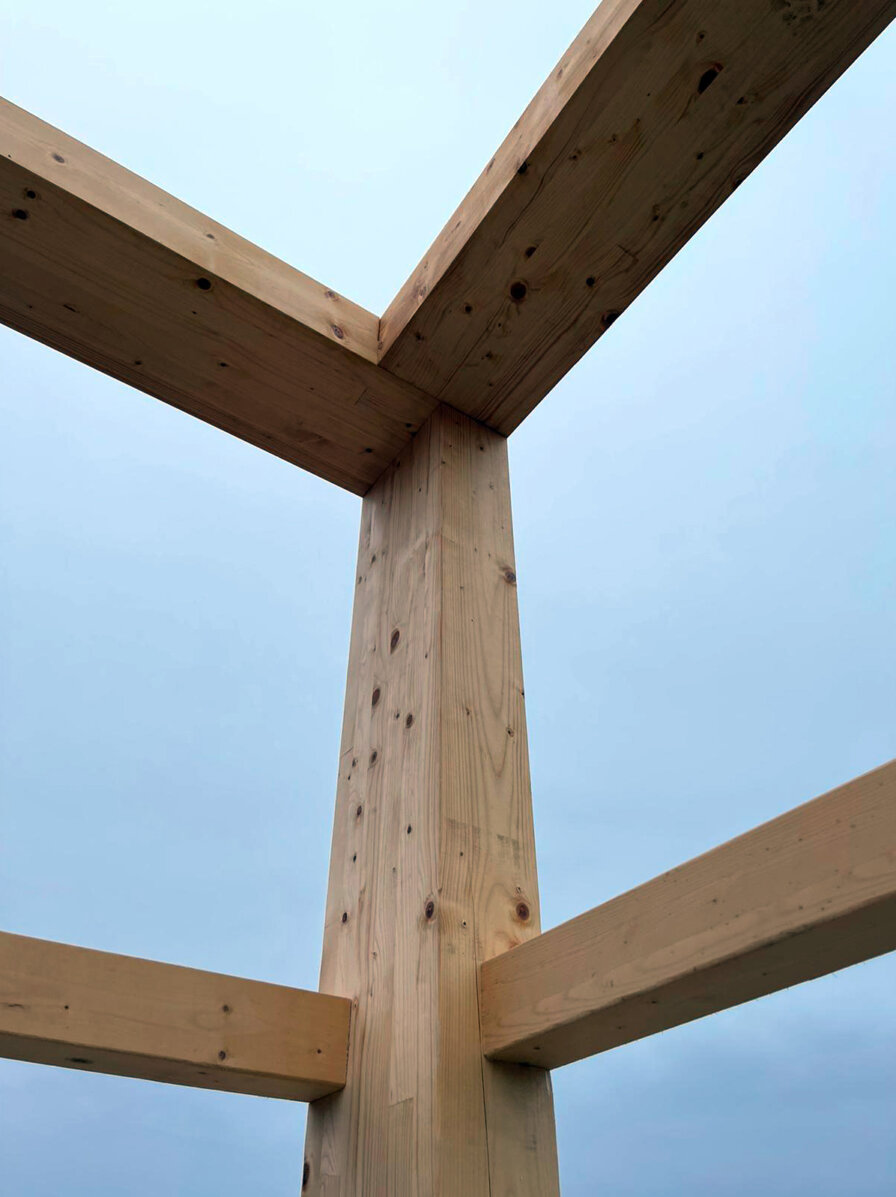 Building a grindanaust characteristically implies using less wood than building a log cabin; in past times, the compact grindanaust was easy to disassemble and move, and was often sold in bulk. The modern use of CNC-milled elements follows this culture of disassembly and motion. As a flexible, reusable system, it answers both economic and environmental motivations that are emphasised at 3RW, while sacrificing nothing of scale and architectural elegance.