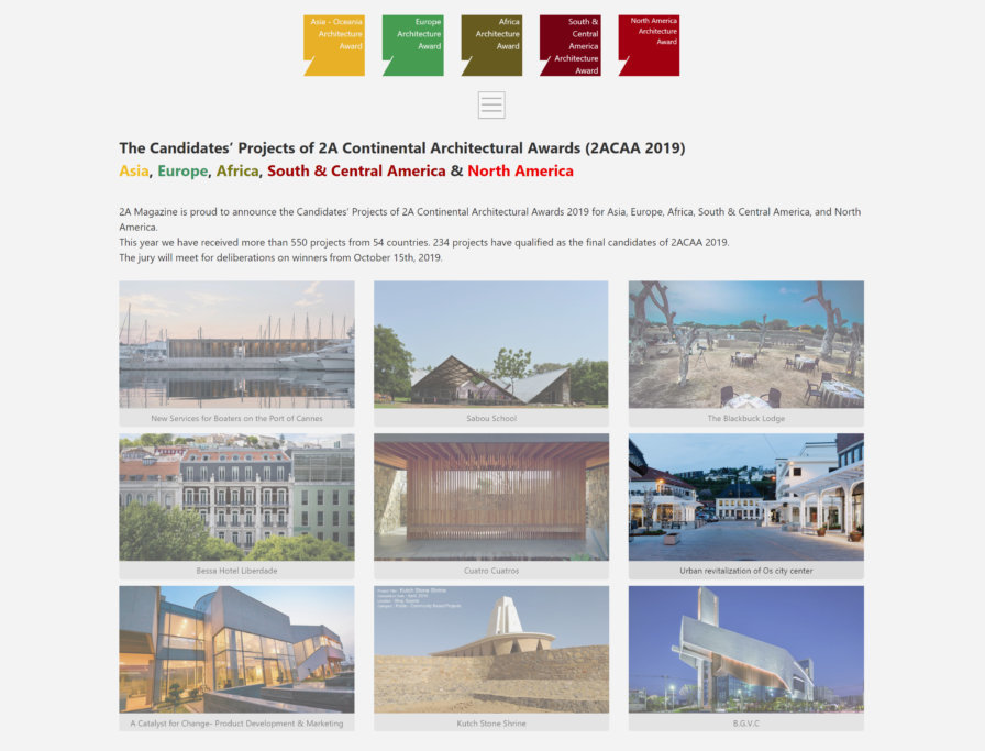 Organized by 2A Architecture & Art Magazine, the 2A Continental Architectural Award was founded to “pay tribute to the living architect or architects whose architecture and artwork exhibits a blend of those qualities of ability, vision, flair, and dedication”. These awards honor the architecture and architects that may have produced “regular and noteworthy contributions to the human race and the built environment” by making a strong use of art and architecture.