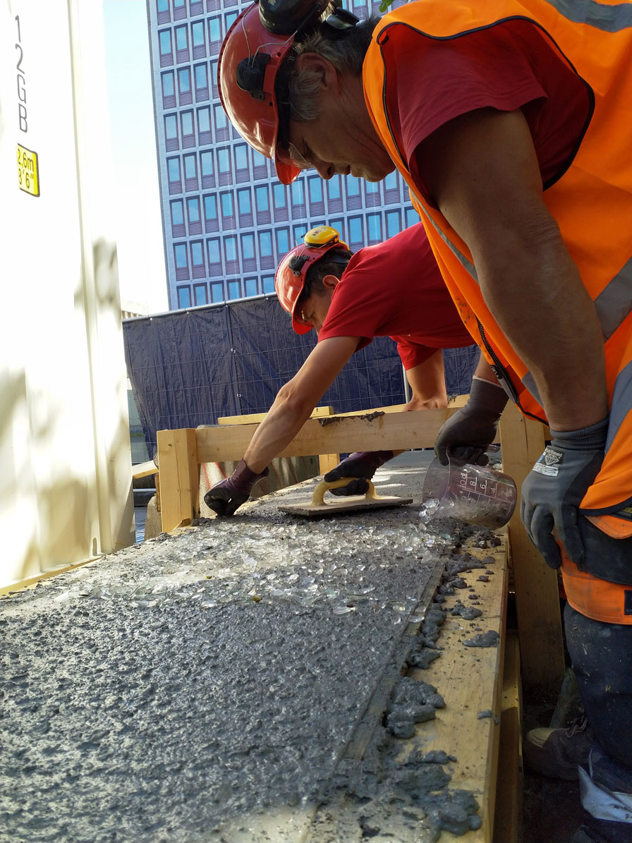 – Rundt 17 kubikkmeter resirkulert og tromlet glass brukes til å fylle området mellom gangpassasjen og ringmuren. Tromlet glass er også støpt inn i betongen i passasjen. 150 meter med LED-lys er plassert i glassgrusen og langs gangbaner for å lyse opp plassen.