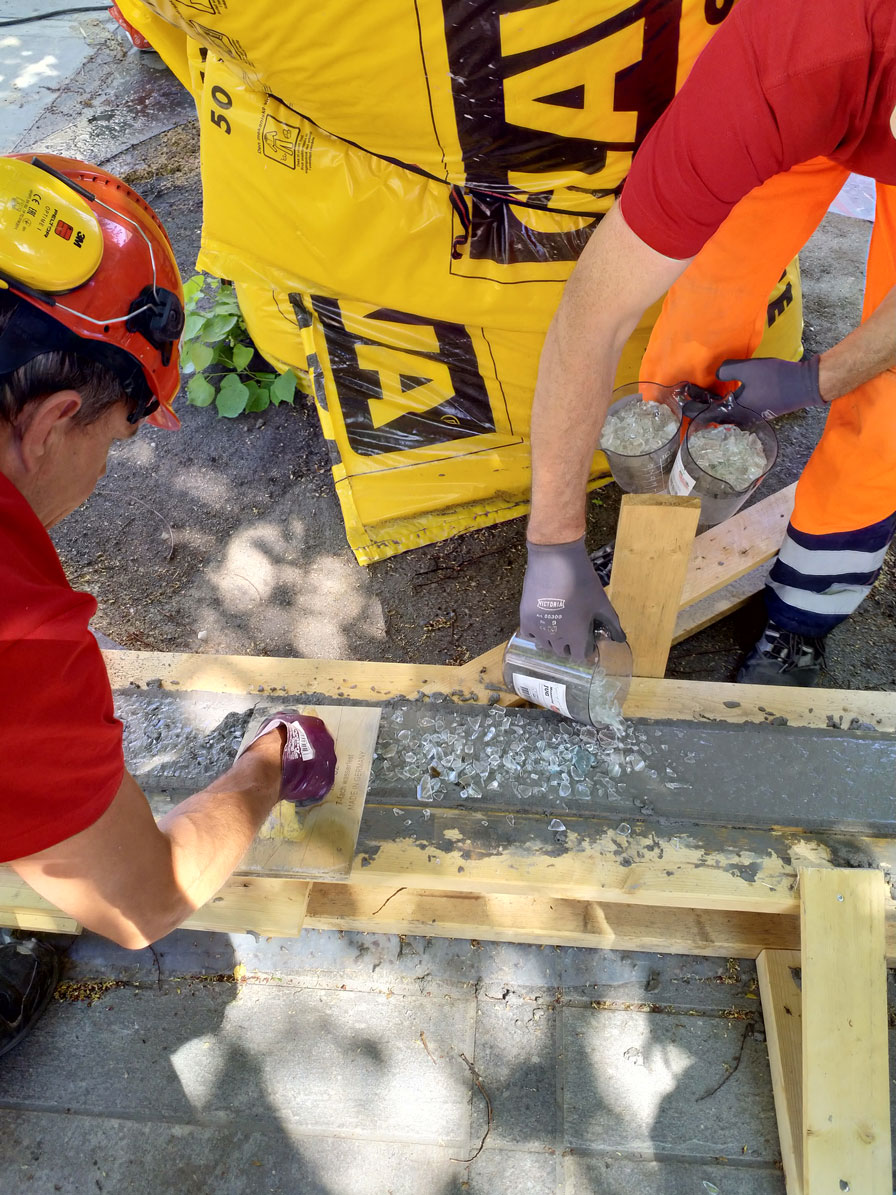 – Rundt 17 kubikkmeter resirkulert og tromlet glass brukes til å fylle området mellom gangpassasjen og ringmuren. Tromlet glass er også støpt inn i betongen i passasjen. 150 meter med LED-lys er plassert i glassgrusen og langs gangbaner for å lyse opp plassen.