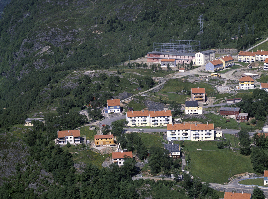 This archive photo shows the site in 1960-07-04, with the transformer and the power station visible in the upper right corner, and the single-family houses and housing blocks distributed around it. The pillars of the Ulriken cable car are already built. Source by Marcus / Spesialsamlingene ved Universitetsbiblioteket i Bergen; see the project’s webpage for a contemporary depiction of the site.