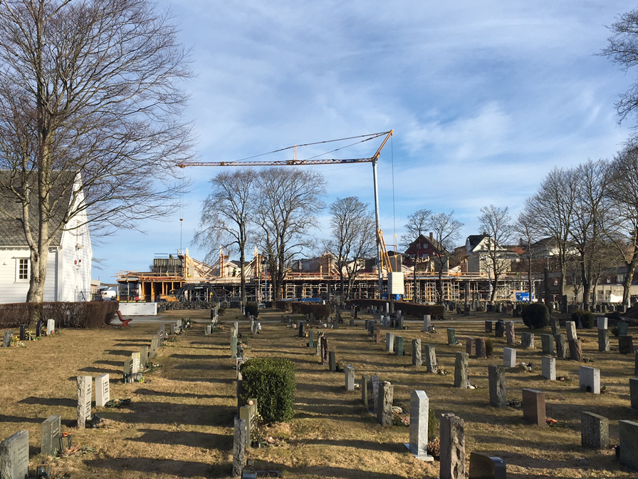 As seen through the cemetery our Sunnhetsgrenden Vardheim Healthcare Centre in Randaberg is starting to go up!