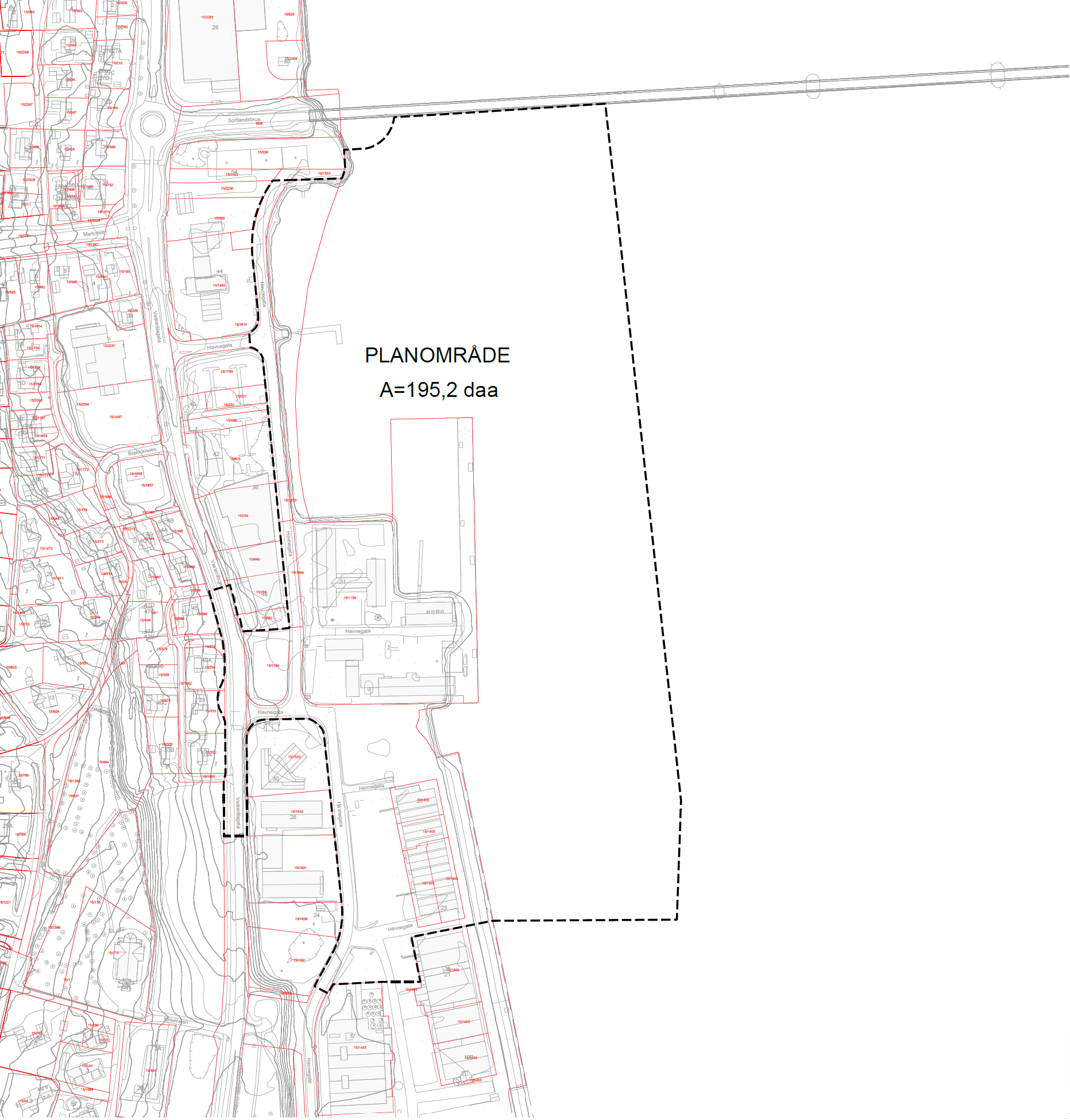 Planområdet er på om lag 195,2 daa og omfatter dagens stasjonsområde, i tillegg til nordre del av havneområdet sør for Kystvakten og parkeringsarealet på motsatt side av gaten for Kystvaktstasjonen. Parkeringsarealet er eid av Forsvaret. Det er dessuten inkludert en del vegareal i tilfelle det er behov for utbedringer/endringer eller av andre plantekniske årsaker. Plangrensen er også lagt ut til grensen for gjeldende reguleringsplan i sjøen, i tilfelle militært forbudsområde i sjø skal inkluderes i planen. Området er regulert til Offentlig bebyggelse (avsatt til område for Kystvaktstasjon) i eldre reguleringsplan med plan-ID 2001154 – Sortland Sentrum Nord. Sør for Kystvakta er det regulert Havneområde og Anlegg i grunnen i samme plan. Plangrensen følger gjeldende plans grense mot vest, rundt krysset Vesterålsgata-Havnegata. Sjøarealet er regulert som Skipsled. Plangrensen er justert noe sammenlignet med plangrensen som fulgte planinitiativet. Dette er gjort for å sikre god tilpasning til tilgrensende planer og for å gi muligheten til å vurdere hensiktsmessig utforming av trafikale løsninger i randsoner innenfor planområdet. Det er ingen pågående planer i, eller i nærheten av planområdet.