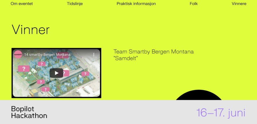 We are very pleased to have received the first prize in the Bopilot Hackathon 24-hours event, with our proposal for a digital platform inspired by Montana, a sustainable housing collaboration between BKK, Sweco and 3RW! The jury of the national online idea competition chose the playful “samdelt” as the winner among dozens of proposals.