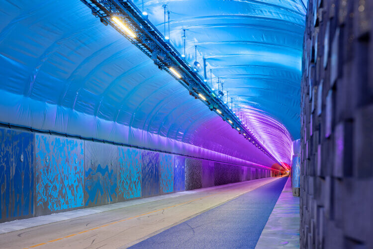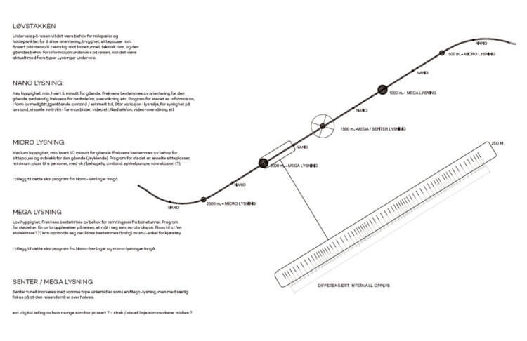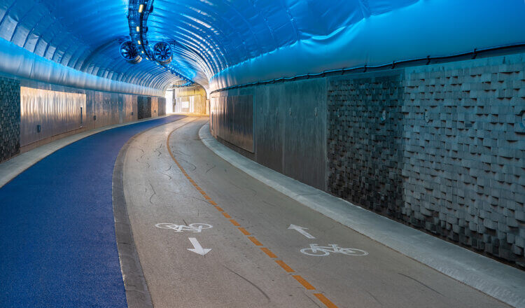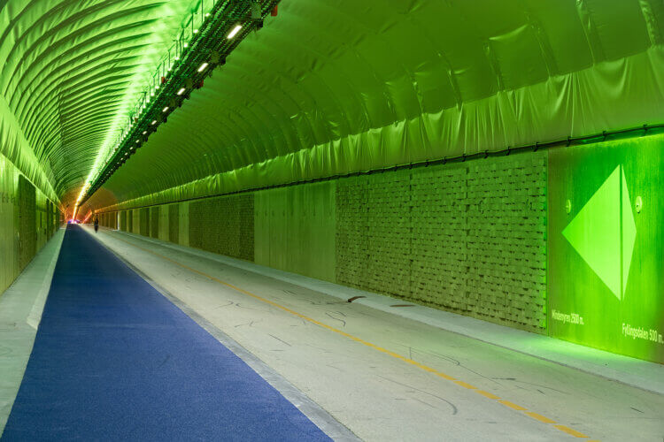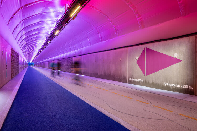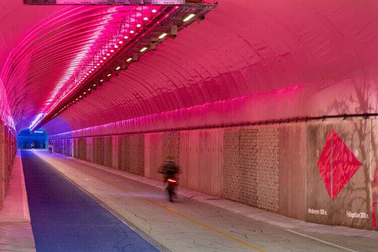 In the planning phase of the long tram tunnel through Løvstakken mountain, clients wanted to secure infrastructural escape routes through stairwells. 3RW and the advisory group proposed to convert the routes into a long escape tunnel, which could also be used for cycling and walking: this allowed the creation of a connection between Bergen’s center and the neighboring area of Fyllingsdalen, which is located on the other side of the city’s mountains. The new Løvstakken bike tunnel reaches an impressive three kilometers in length; it was crucial that it was built in ways which secured a good and safe experience of the space. With the help of a psychologist, a lighting designer and engineers, 3RW formalized the concept for the world’s longest cycle tunnel.