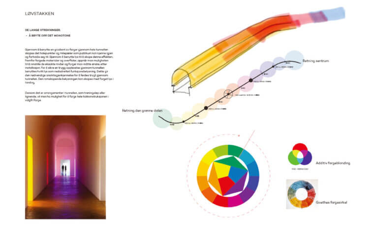 Lighting plays a key role in 3RW arkitekter’s vision of the Løvstakken tunnel. Pockets of rest space—secured anchor points—are made visible from afar. Three opened rooms are designed, with the central opening comfortably adorned with benches and light sculptures. Finally, following inspirations from Goethe’s ‘additive color mixture’ (a nine-part color triangle with the so-called primary, secondary, and tertiary colors), 3RW’s concept proposed that light colors partially change every 250 metres. Fyllingsdalen starts with green; the centre finishes in blue. The warmest colors light up the middle of the tunnel, where most visual security is needed. A general feeling of coherence and continuity is achieved through the use of this coloured lighting scheme.