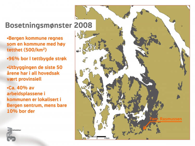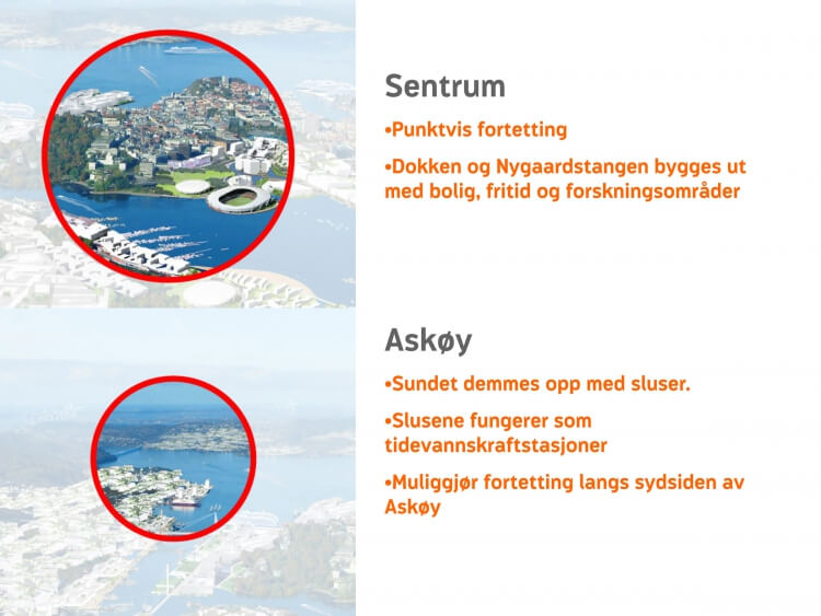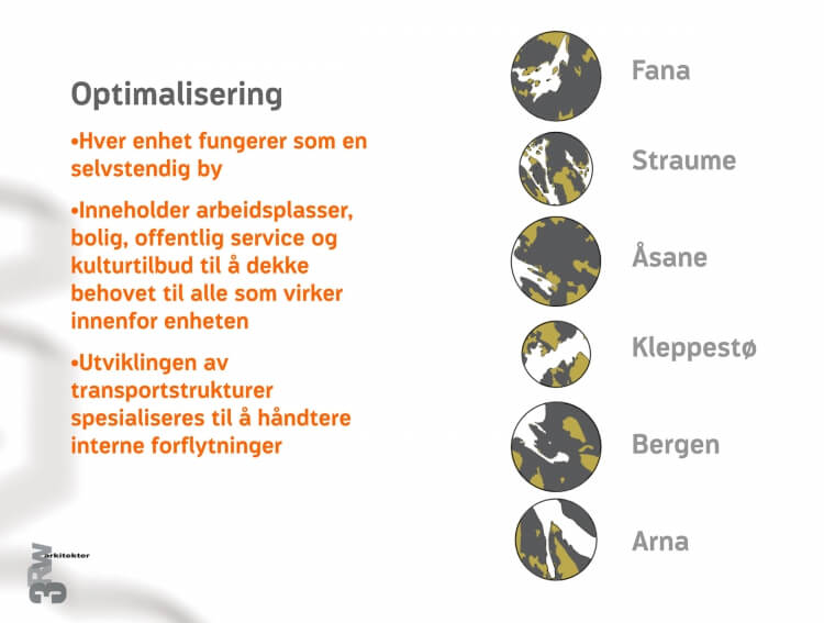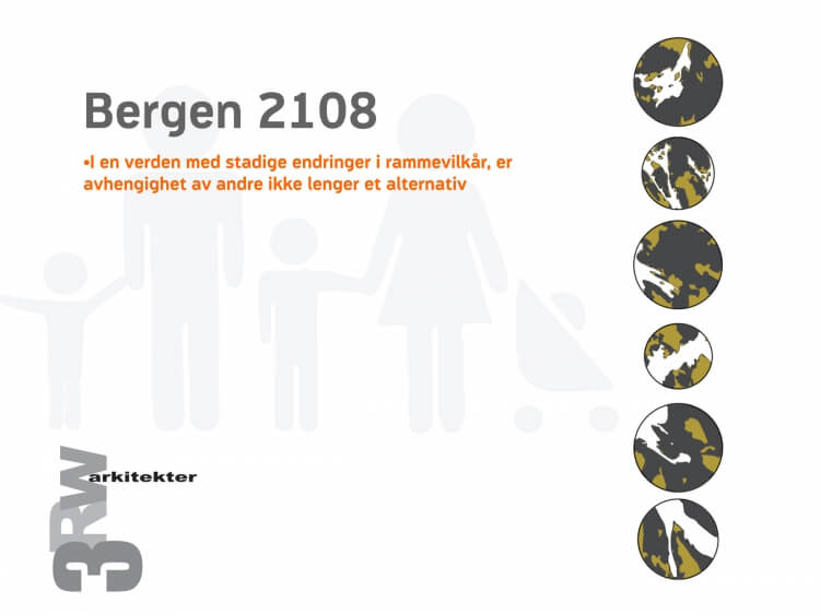The development of the municipality of Bergen the next 100 years will be governed by the need to have a geographically concentrated daily business. As the oil decreases, the price of this increases dramatically. Thus, energy costs push forward changes. Through the requirements of users, some areas will crystallise where there is possible to live; enclaves where it will be possible to both work, live, have kindergartens, schools etc. These areas will experience a large-scale densification at the expense of more peripheral areas. The enclaves must be optimized in order to operate as independent cities. One must strive to achieve a programmatic balance, a 1 to 1 relationship between housing and jobs. But first and foremost, it must be made plans for how a densification can happen.