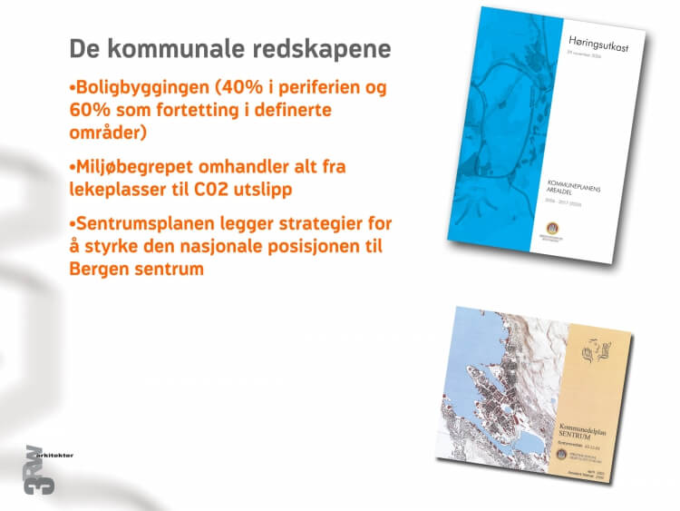 Bergen must make a dramatic change in relation to the normative provincial development which is still actively going on. There must, on the basis of a need for new and more highly densified urban areas, be worked up specific plans for how a densification of the city’s central areas will happen. In this context, the need to redefine the role of the planner should be emphasized.
