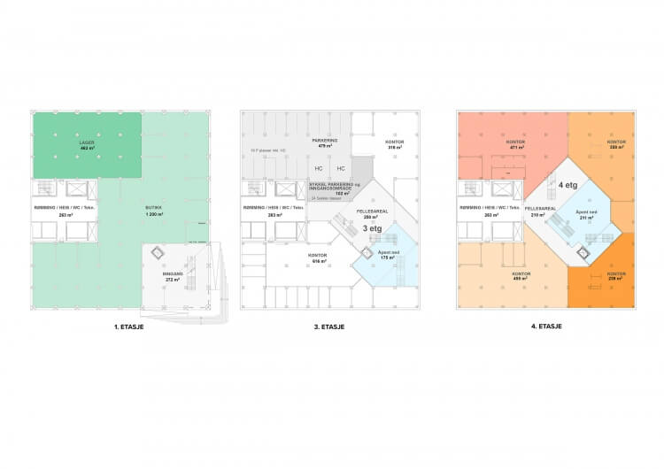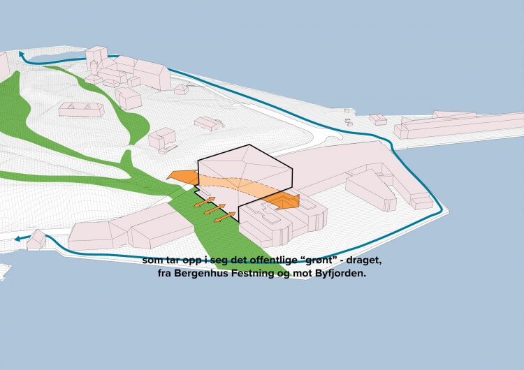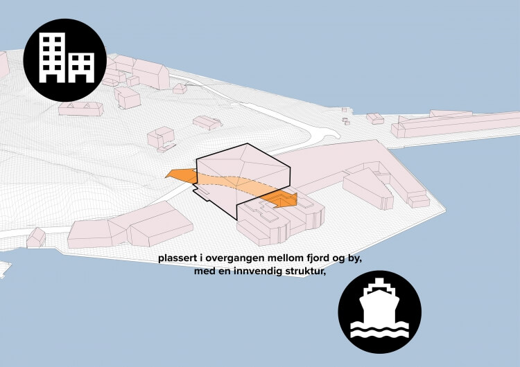 Access to all floors is thought to go through a displacement in the light shaft, and one moves through a varied interior landscape from a new entrance in southeastern corner of the bottom floor to the top floor at the building’s northern and middle parts. Up here you will get views of the fjord. The light shaft remains within the block’s façades, and will thus not be a visible form from the outside.