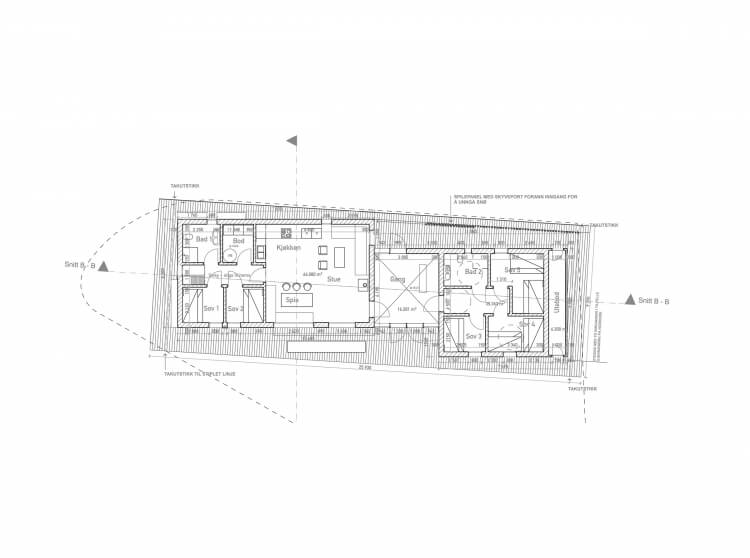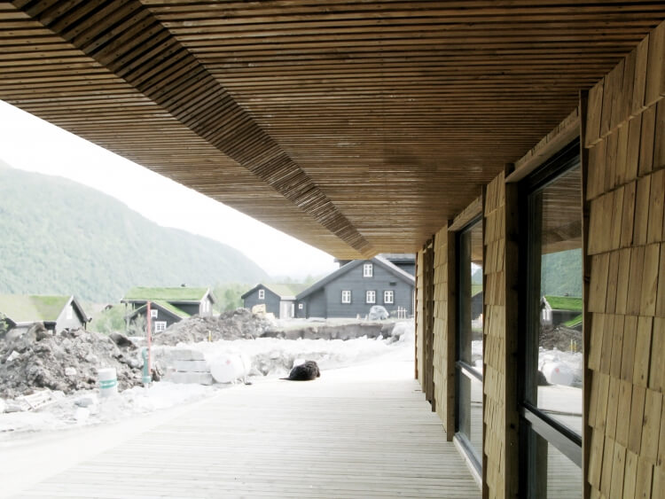 In the cabin in Myrkdalen, the half-climatized zone is in the middle of the house functioning as entrance and a passage between the entrance and terrace towards the light and the view. On either side of this zone are bedrooms for extended family and with living room / kitchen located towards the semi-climatic zone. The cabin is adapted for three generations where the grandparents live in one part and the family with four children living in the other. The interaction happens in the living room and kitchen. Lofts over the two sleeping sections create sleeping space for an entire school class if desired. Ski storage room faces the wind and weather, and protects the rooms inside.