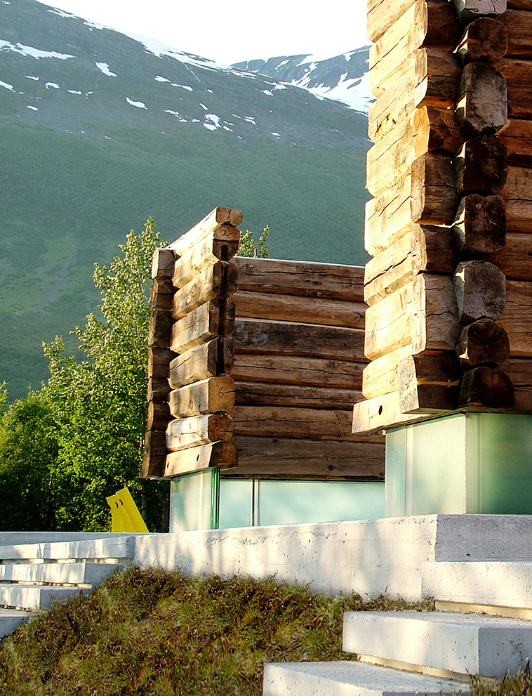 Reuse is a driving principle in projects of varying scales. Smaller interventions represent interesting opportunities to test out inventories and new assemblies of existing materials: the re-purposing of centuries-old timber logs from a nearby farm at the Flydalsjuvet rest stop is an example of this kind of small interventions. Craft, technology and architectural innovation combine in a past-meets-future composition of aged wood and contemporary glass. With its evocative surfaces and tectonics, the Flydalsjuvet project nicely illustrates the potential of reclaiming aged, ‘imperfect’ materials.
