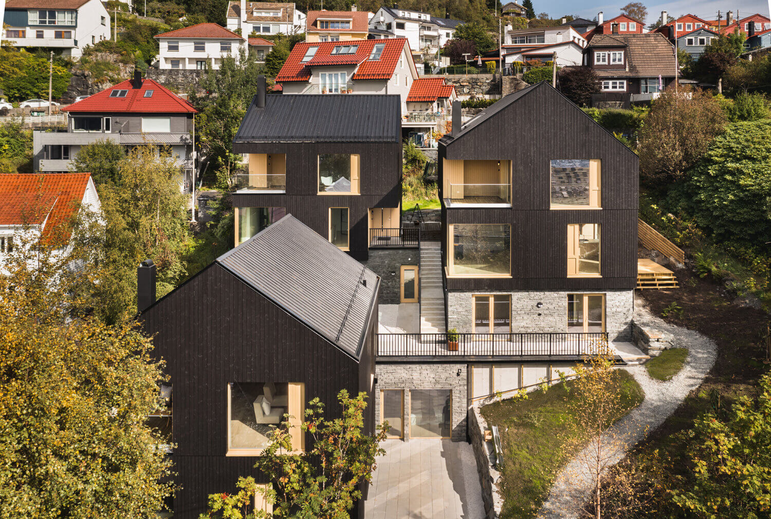 Most of our built works is found in Norway, a country which has a third of its land forested. 43% of these forests are composed of mature, harvestable trees; they are certified PEFC-sustainable, a label granted to socially just, ecologically sound and economically viable forest management. The close proximity of wood resources represents a true opportunity for 3RW to engage in the local sourcing of a renewable, generally non-polluting, low-energy and low-emission material – given their Nordic acclimatisation, the dense Norwegian spruce and Scots pine make for a high-quality architectural choice. The office compiles over 20 years of experience with timber construction, which is expressed throughout a range of scales and programs; we were among the first architects in Vestland to use a CLT structure, for the assembly of the Bergen-based Steiner School (2004).