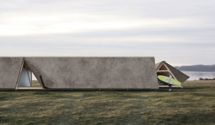 Historically, the structures built in the Scandinavian coast have been developed using a building and material system tailored specifically to withstand the area’s climate, while being flexible for changes in use. The main construction material used here is wooden beams, which are raised to form a roof rack. Still today, this type of assemblage is optimal for the creation of large open spaces, as it provides an open and flexible construction system that can be extended as needed. The method also requires an exterior coating that protects the wood structure from undesirable wind and weather. Such building principle can be traced back to the first long houses built in the Viking age, as well as to most Nordic wooden churches, stables and boat houses. Users’ encounter with the nature of Thy is mediated with a simple building technique that shields them from hostile winds and temperatures.