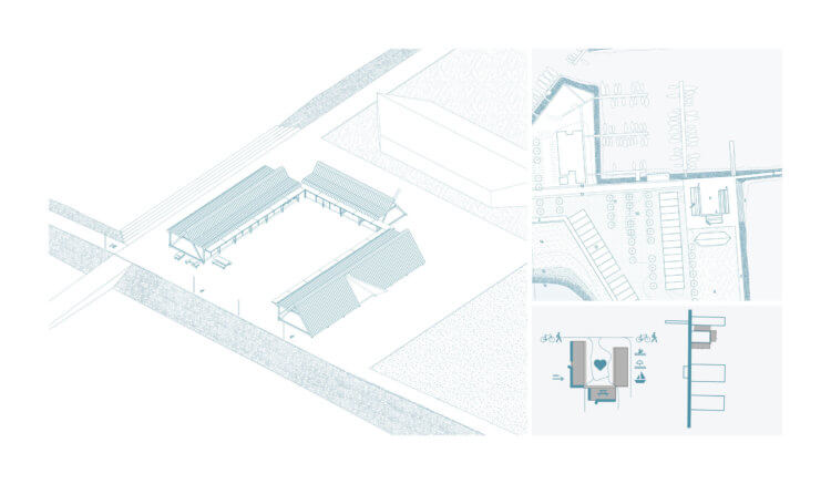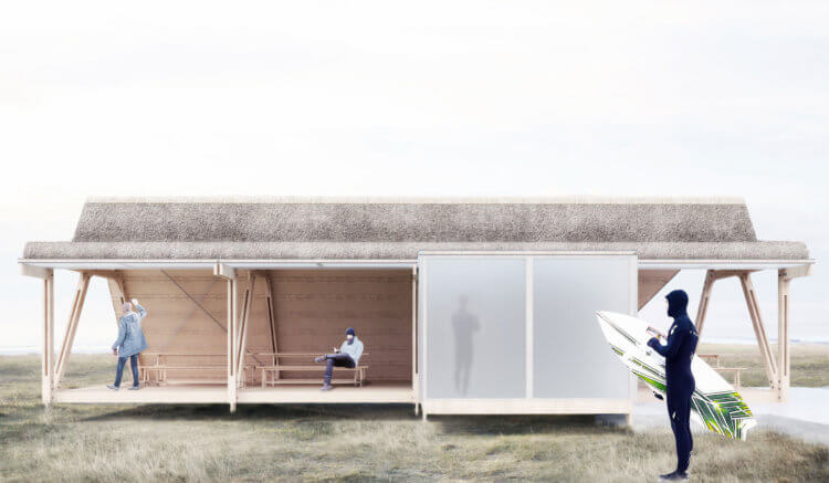 Throughout the proposal, the architecture acts as windbreaker, allowing users to dwell in the modules despite strong gusts and observe the surfers on the water. Designed as modular buildings with a thick protection against the wind, the structures open up to the landscape. The modules bring people and places together through the potentials and stories of each site and its landscape. Depending on programme, they are designed as flexible units able to become open-air structures, closed buildings or to host glass modules with storage, changing facilities and other services.