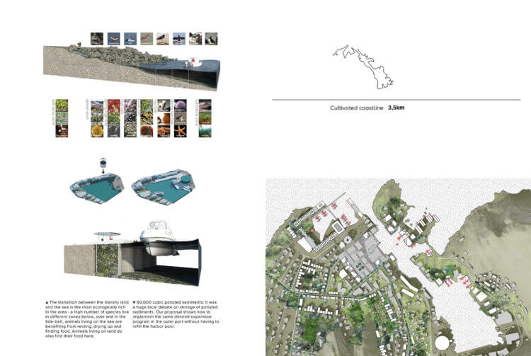 The coastline around the harbor is roughly 3,500 meters long. Proposed plans for massive fillings in the sea provide an undesirable leveling of the coastline, which provides fewer contact and activity points along the bay-side. The potential of the existing coastline in the harbor should be further cultivated and made longer – not refilled and shortened on. Fosnavåg is missing point of contact with the sea which can be a hybrid between the natural and the purely industrial. The potential will be fulfilled through making good transitions between land and sea where recreation for the people in town are in particular emphasized. In these transitions, the city by the sea can also recover its identity.