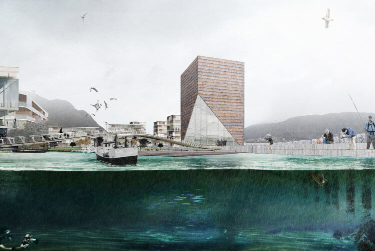 A future development strategy for Fosnavåg connecting the town development with the harbor and the natural bay with publicly-accessible spaces and new programs around the unique harbor