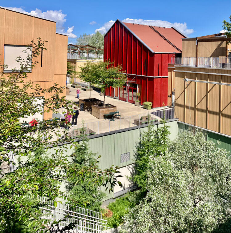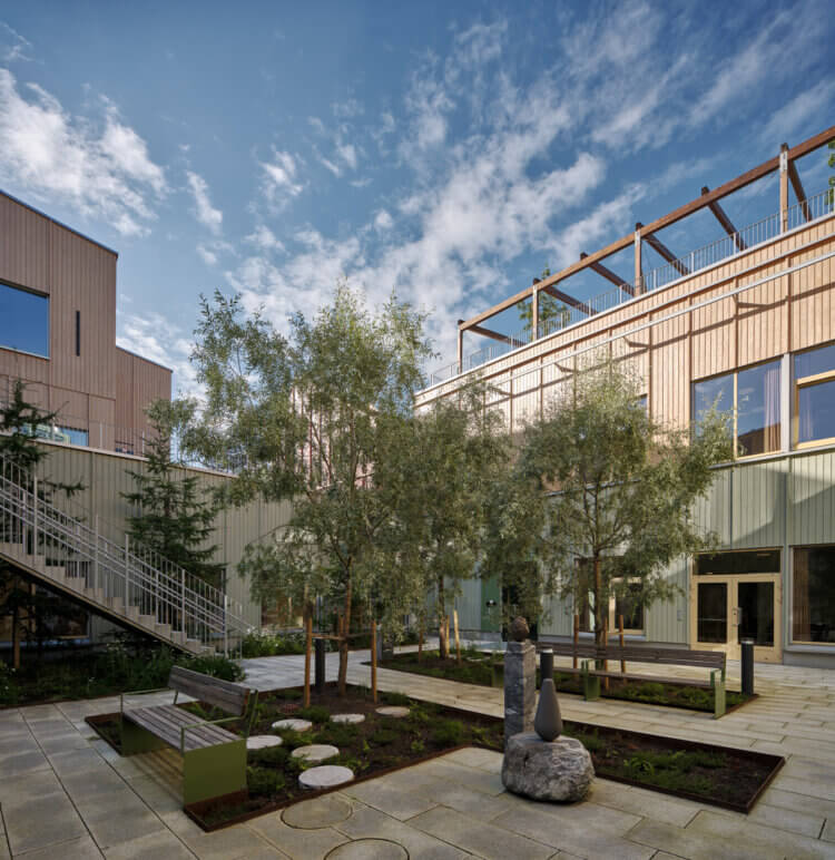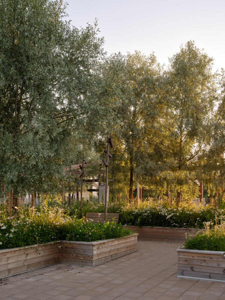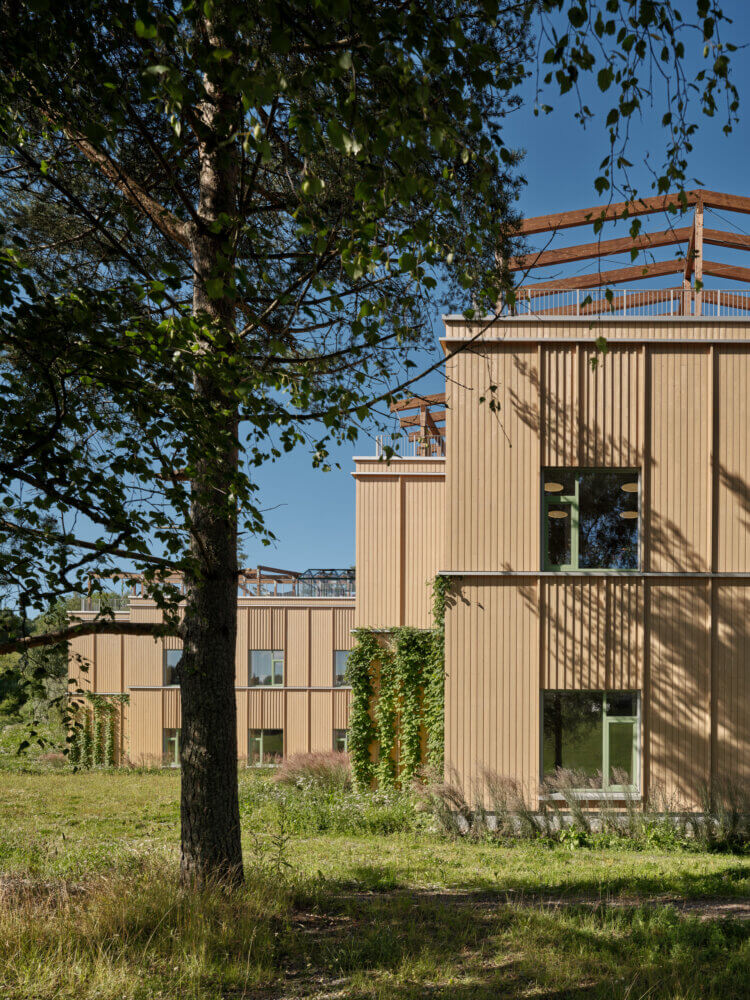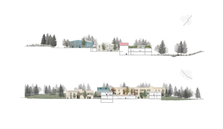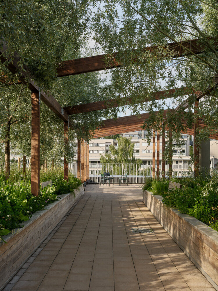 A sloped terrain led to the creation of the ‘Green Circular Trail’ which connects two large gardens, and wraps the buildings in greenery.