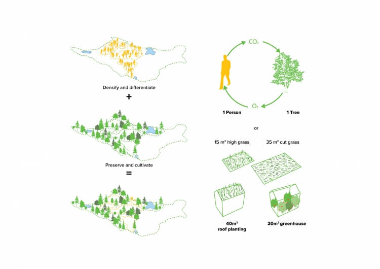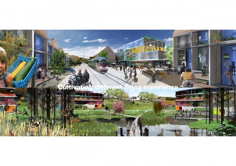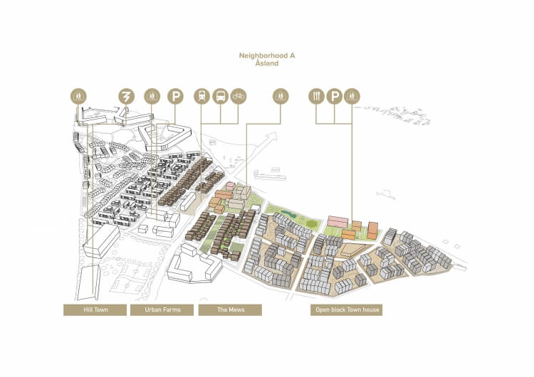 The masterplan is premised on four key planning concepts: (1) establishing a clear landscape framework to protect the farmland and local habitat from future development (2) making parks and open spaces that are linked to the surrounding forests and farmlands (3) building neighbourhood centres that have distinctly different identities, architectures, public spaces, streetscapes and relationships to nature (4) building a network of social amenities that are linked by public transport . The masterplan establishes five character zones: