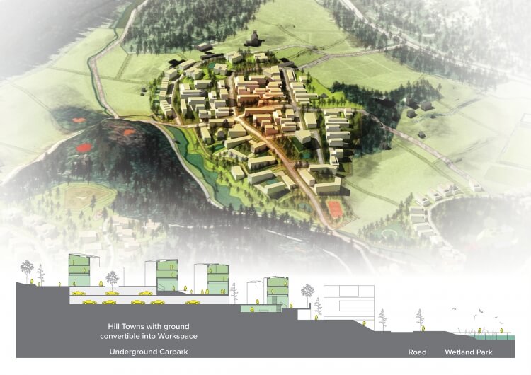 The centre is characterised as a contemporary ‘hill-town’. Clear building edges establish the character and feel of the main public spaces. A network of public squares, promenades, mews, courts and lanes intensify the spatial diversity. The arrangement is organised to ensure that every dwelling gets a view of the surrounding farmland or hill-side.