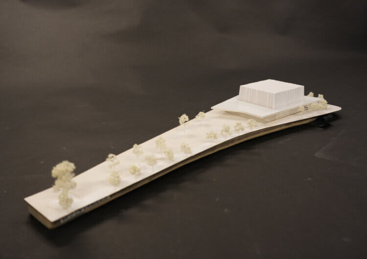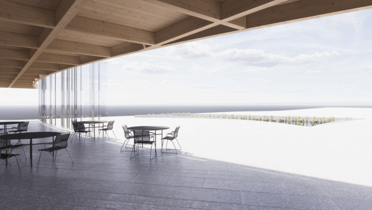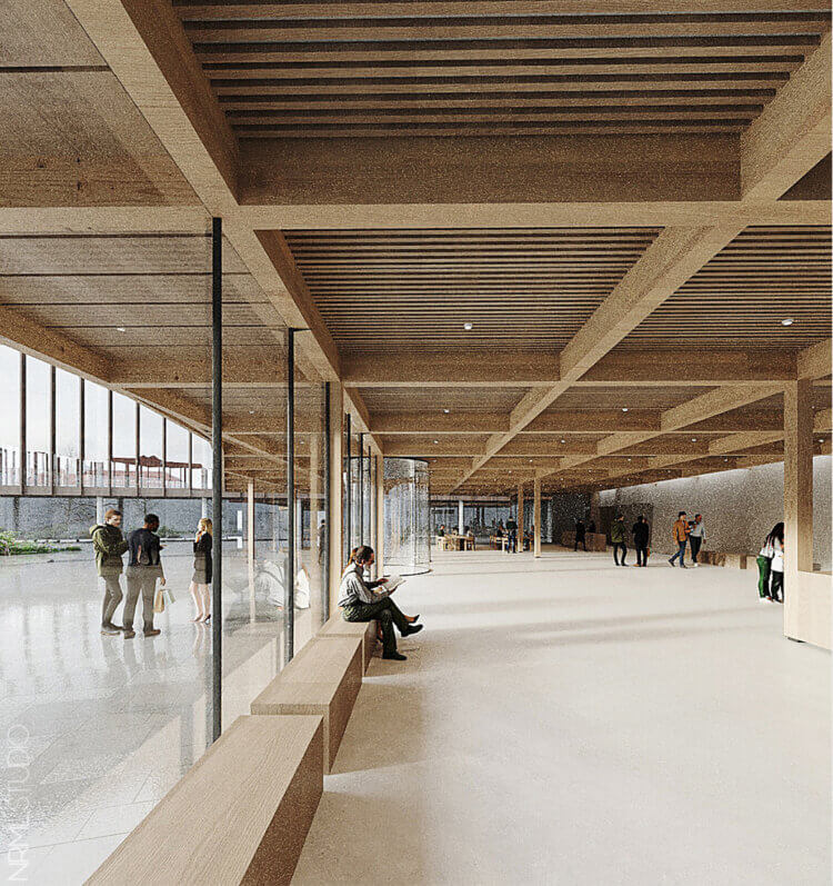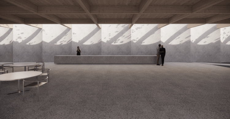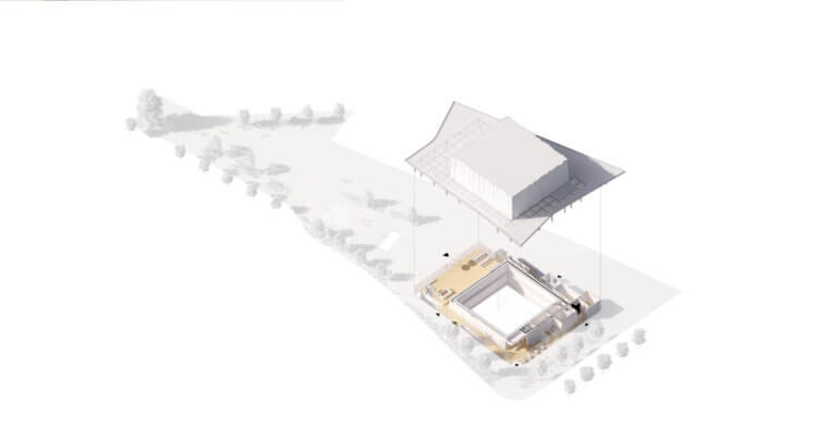 Above ground, the design is minimal: a transparent pavilion and stage tower surrounded by a deep roof overhang that provides sheltered circulation in any weather. The foyer opens directly to the public realm and can host small performances or exhibitions, while retractable facades allow larger events concerts, film screenings, and outdoor exhibitions to spill seamlessly into the square.