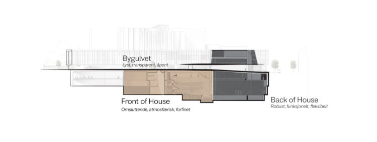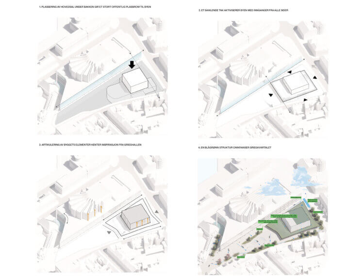 The new Music Theatre in Bergen’s Grieg Quarter will be a cultural landmark that unites the city’s heritage of woodcraft, its vibrant artistic life, and its proud identity as “the rainy city.” Designed as an inclusive urban living room, it offers a generous public space at street level, where culture and city life flow seamlessly together. Most of the theatre is placed below ground, allowing the urban space above to remain open and active, framed by a light, glazed pavilion with entrances on all sides.