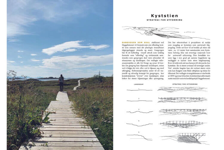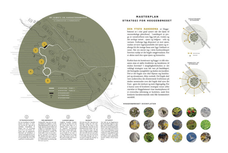 Den ytre delen av neset er i stor grad urørt og har naturlege kvalitetar som ein i størst mogeleg grad skal verne om. Samstundes er det trong for noko tilrettelegging og betra tilgjenge gjennom universelt utforma gangveg, samt etablering av eit servicebygg for lagring og sanitære fasilitetar for offentlegheita. Til oppdraget har det lagt å formgi eit servicebygg på om lag 25 m2, teikne inn og gi føringar for turveg gjennom området, samt å lokalisere og gi uttrykk konstruksjonar for stuping, fiske og flytebrygge for å legge til med småbåtar. Studien gir rammar for ei strategisk utvikling av området med vekt på formuttrykk, materialval og terrenghandsaming.