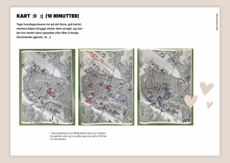Site work is conducted in Lillestrøm, which the municipality has identified as a sensitive social site: students of Sophie Radich Secondary School do stand out negatively in Norway’s Youth Data Survey, when it comes to feelings of safety in the school’s immediate and nearby environment. Part of 3RW’s task links to the more general development of an urban plan which encompasses large parts of this environment. This context justified the decision to focus our attention on Sophie Radich students, and their ‘everyday journey’ through the center of Lillestrøm.