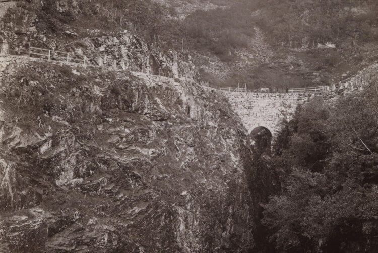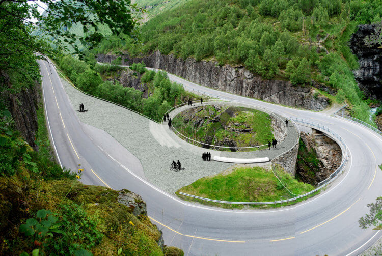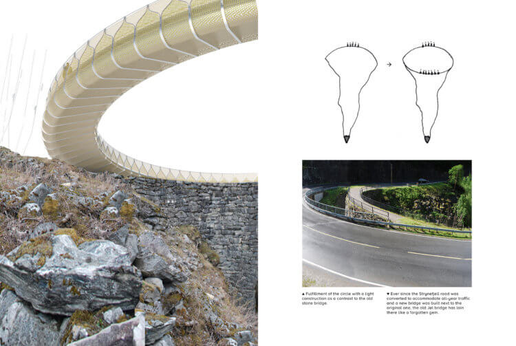 The aim was to emphasize three elements. First, to draw attention to the bridge’s uniquely hand-crafted construction, formed in an apparently perfect semicircle – a unique piece of road craftsmanship dating from 1883, second, emphasize the gorge and its swirling river 60 meters below, and third, to fulfill the circle with a light construction as a contrast to the old stone bridge for united observation of the unique space.