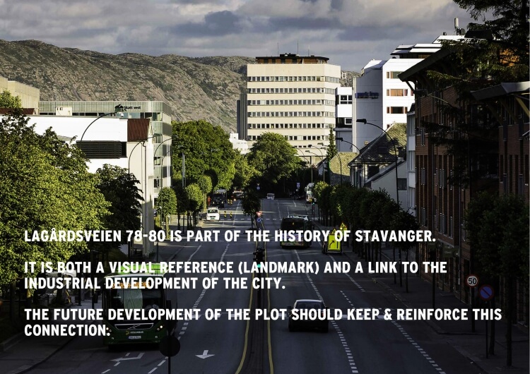 Lagårdsveien 78-80 is part of the history of the city. It is a visual reference -landmark- that refers to the industrial development of Stavanger. The future development of the plot should keep and reinforce this connection.