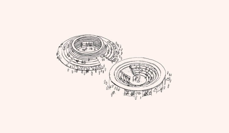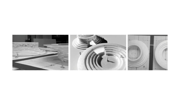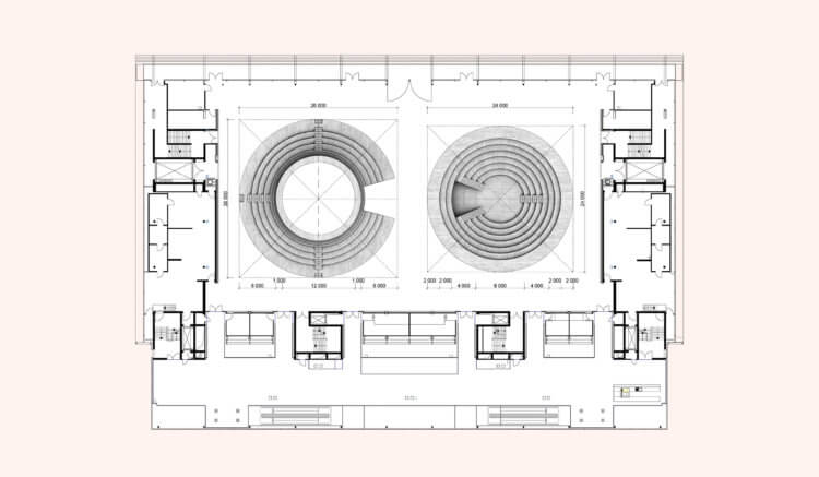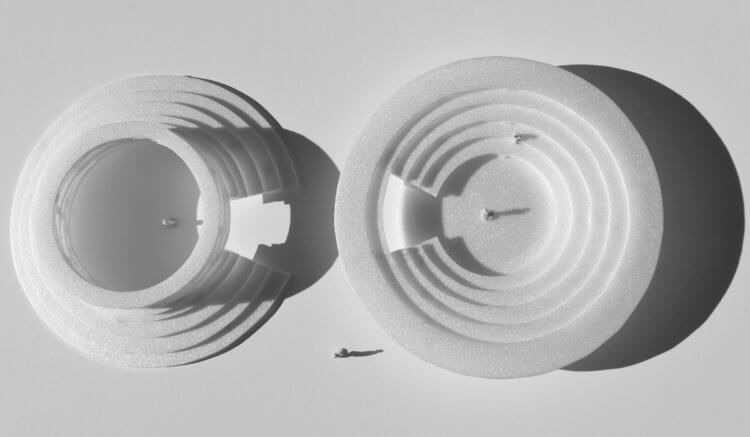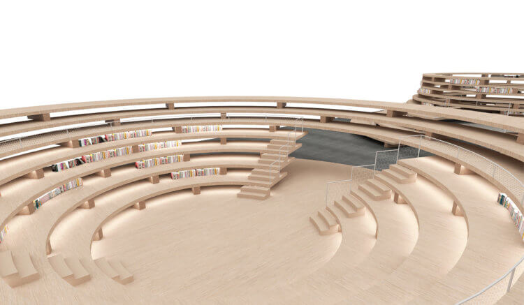 “Cave” and “Clearing” are two circular wood pavilions proposed for the Norwegian Pavilion at the Frankfurt Book Fair in October 2019. Used as information points and meeting places for forums, press conferences or reading, their circular shape puts literature at the literal centre of the user’s experience. “Cave” and “Clearing” are respectively convex and concave pavilions that use terraced wood elements that act structurally and define the inner and outer spaces. Books are found in-between the wood lamellas of the stepped structures, hence made available for consultation to all visitors.