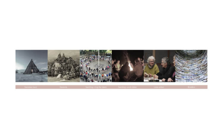 An iconic form of social gathering and interconnection, the circle evokes notions of togetherness, conversation and protection. Both literature pavilions relate back to Northern culture, where traditional Sami lavas are built in a circular shape to insure safety and strengthen feelings of belonging to the community. Moreover, the circle recalls universally shared experiences of gathering around the fire, or dancing in circles. By placing the “Cave” and the “Clearing” in the Book Fair’s rectangular exhibition room, a place for social interactions is made recognisable.