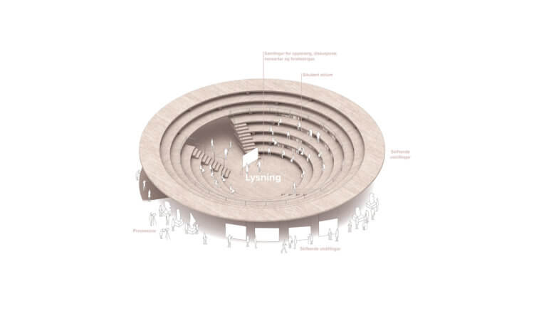 Bolted massive wooden elements are modulated to form the project’s circular architectures. They are placed in a way that insures an easy assemblage and disassemblage technique, as well as a transparent expression. This construction type – with its efficient wood pieces and joints – echoes Norwegian building tradition, while its pale colour and plywood finish recall a more contemporary, DIY architectural aesthetic. The choice of wood was likewise confirmed by its renewable qualities and low CO2 footprint.