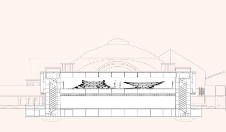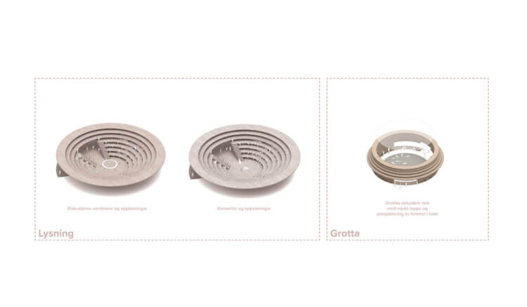 Its neighbouring convex pavilion also forms a terraced landscape where users can sit and read, eat lunch, relax or talk in smaller groups. Distributed along its periphery, calmer areas of the “Cave” are programmed to house reading places, with cushions to be moved around according to people’s needs. Within the structure, the grotto-like room incites silent contemplation and a feeling of tranquillity. Books and benches are placed inside, as well as a soft blanket that softens the floor. A reminder of the rapidly changing Norwegian sky, canvases featuring rain, spring clouds and northern lights are hanged on the hall’s ceiling and can be observed through the top hole in the pavilion.