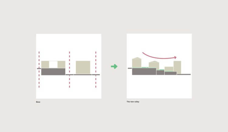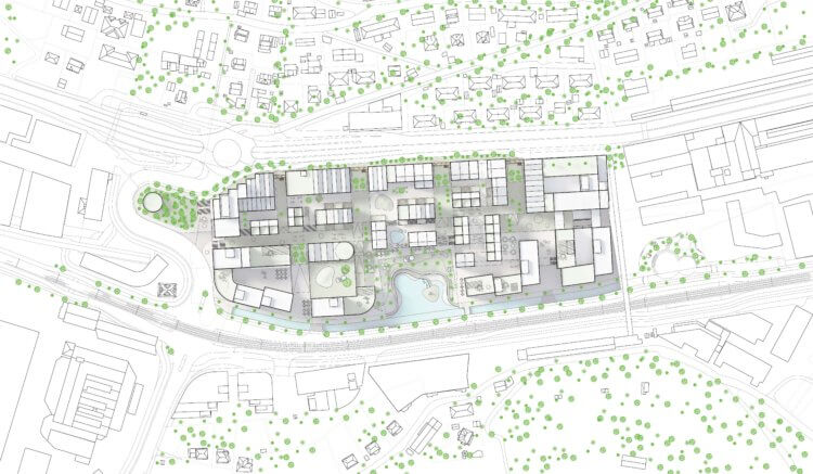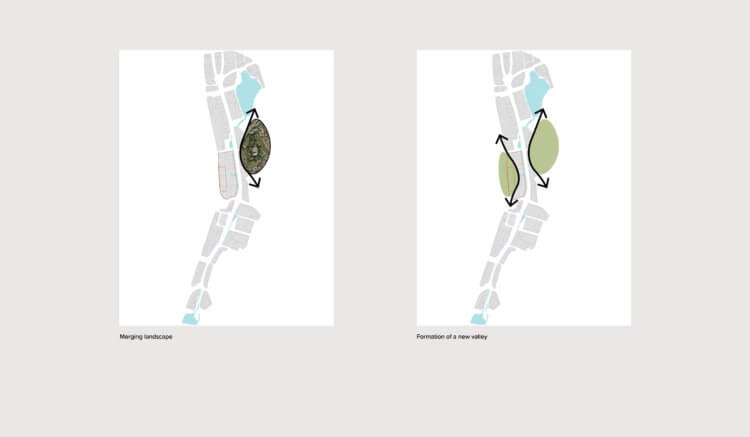 Ultimately, our masterplan devises two typological moments, A hilltown, namely the green valley, and a Downtown, linked to the new light rail line, with more offices and larger building footprint, also acting as a protection from noise and with active ground floor in key locations to become natural destinations. Most importantly around the pond and the light rail stop.