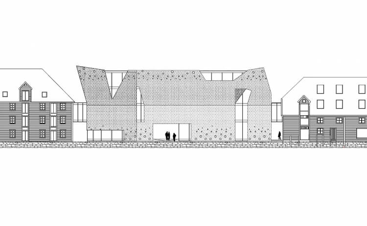 It appears as a building with formal similarities with its neighbours and contrasting with them in the use of perforated expanded metal sheets.