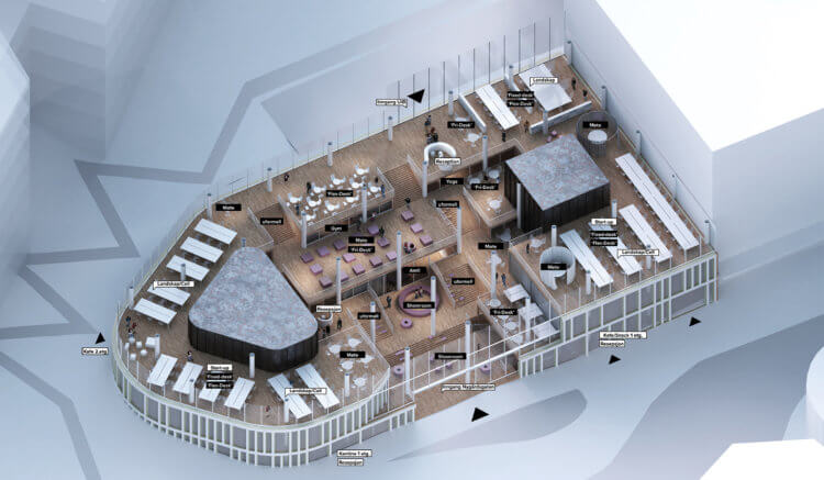 Programs such as rentable conference rooms, bars, gyms and yoga studios complete the public offer. The valley floor allows for a mix of different area typologies, from start-up offices, flexible co-working places, “hot desking” to permanent workrooms, in the hope to attract students from the nearby UiB (University of Bergen), as well as other young professionals. Long and short passages through the Nygårdsgaten 91 atrium are guided by the encountered formal elements: stairs, ramps, room pockets, walls, glass partitions, portals and triple-height ceilings.