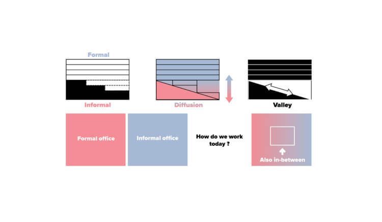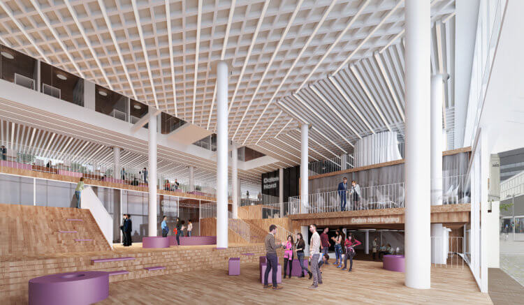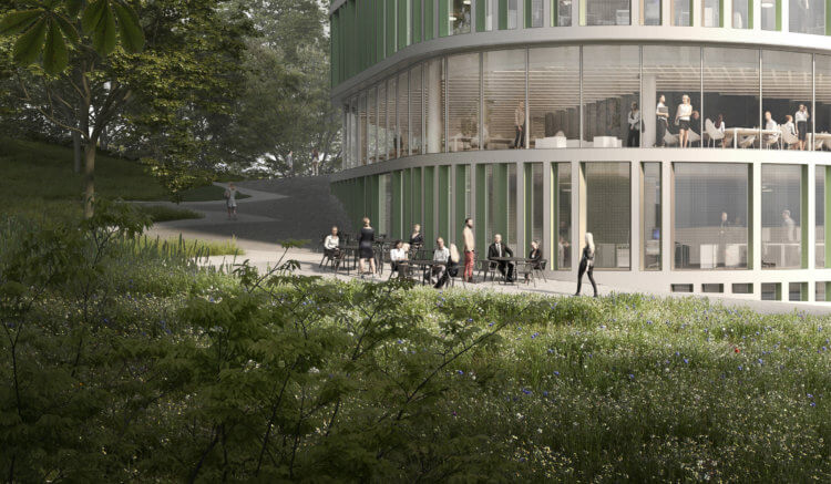 With the intention of creating an office building with outward-looking, audience-oriented features, the project’s team at 3RW focused on formal qualities and gradients of transparency to propose a valley-like working landscape with a generous ground floor. In a nod to its neighbours Media City and EnTek, a traditional covered passage connects the two principal volumes of the building, taking its visitors through a “three-dimensional” sequence of public and semi-public spaces. Our proposal is not resolved in plan, but sectionally: this allows a renewed experience of the ground plane as a transition zone.