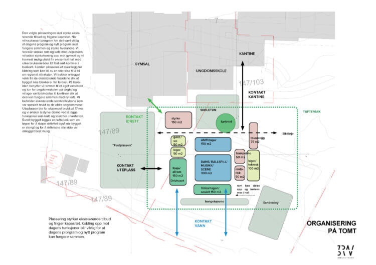 Tomten ligger sentralt i Hafslo, ved mellom skolen, kunstgressbanen og Hafslovatnet. Aktivitetsanlegget blir dermed også et sentrumsutviklingsprosjekt. Samspill med eksisterende samfunnssal har vært sentralt i prosjektet, ikke minst siden aktivitetsanlegget har potensiale til å bli en attraktivitet som vesentlig øker aktiviteten i sentrum.