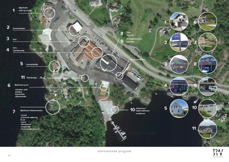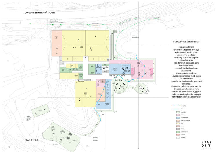 Innledningsvis gjorde vi vurdering av fem ulike tomter på oppdrag fra Samnanger kommune. Tomtene ble vurdert for byggbarhet, tilkomst og samfunnseffekter. Valgt tomt lå sentralt i kommunesenteret Bjørkheim. Aktivitetsanlegget blir dermed et sentrumsutviklingsprosjekt. Samspill med eksisterende kvaliteter i Bjørkheim har vært sentralt i prosjektet, ikke minst siden aktivitetsanlegget har potensiale til å bli en attraktivitet som vesentlig øker aktiviteten i sentrum.