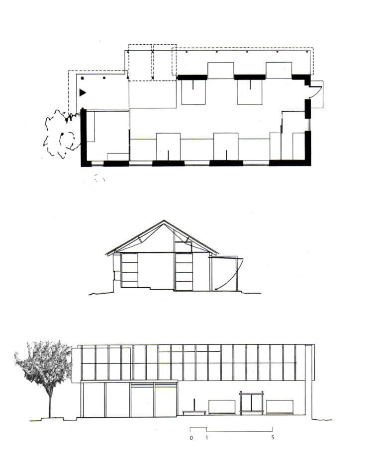 The most plentiful material in the area is stone, and the architects decided to use it as much as possible. They made massive stone walls to the south and west of the complex to protect it from the sometimes burning heat of the sun. The stone acts as a thermal flywheel, radiating solar heat to the interiors at night and early morning. To the north and the mountains, from where cooling winds come, are lighter walls. Big sliding doors open inclement weather. Transparent corrugated plastic is combined with translucent plastic fabric to allow as much light to penetrate as possible. Flaps which are part of the walls at night fold up or down to become sunshades or benches during the day.