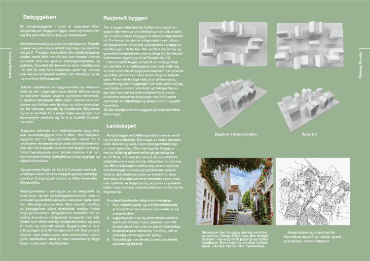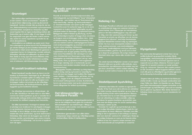 Paradis skal bli et foregangseksempel på hvordan vi bor og levver i fremtiden. Forslaget er tilrettelagt for et bærekraftig liv, basert