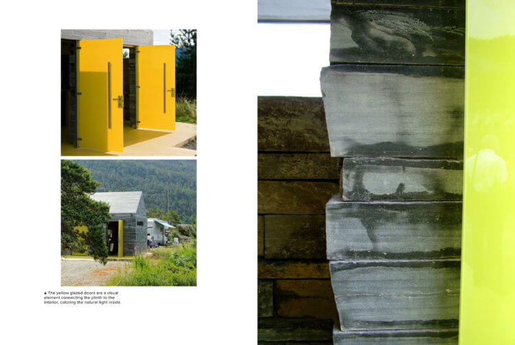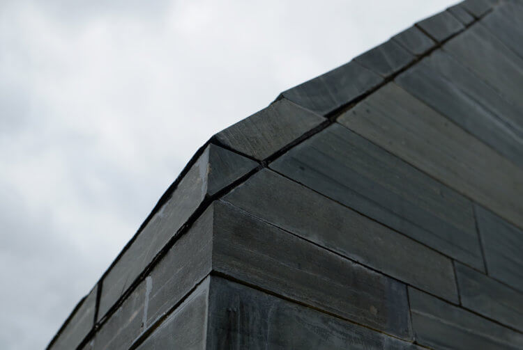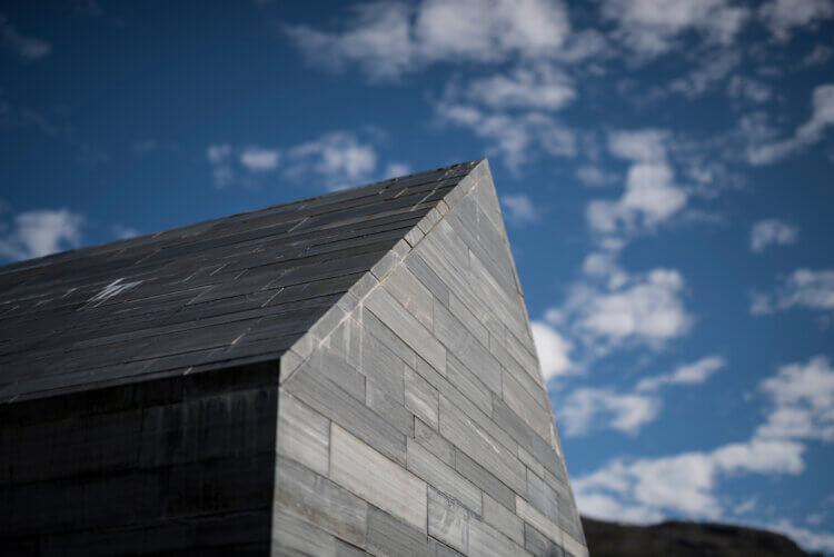 The use of stone slate for walls and roofing has a long tradition in the region. The geometry of the building reflects the traditional sloped roof, but the walls is slightly angled, creating a disharmonious geometry. The construction required a high level of craftsmanship since every stone had to be cut in specific angles.