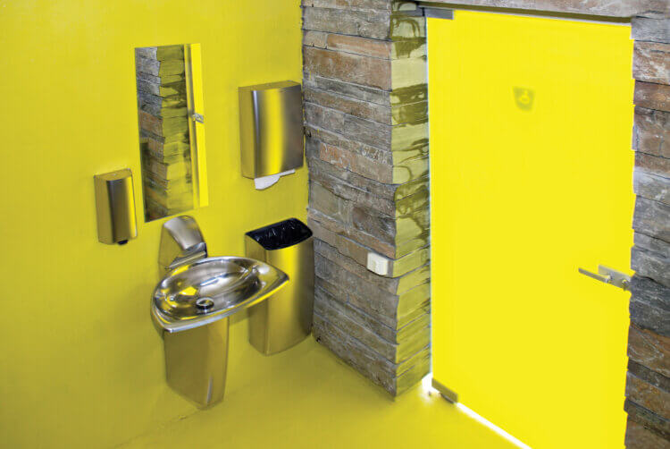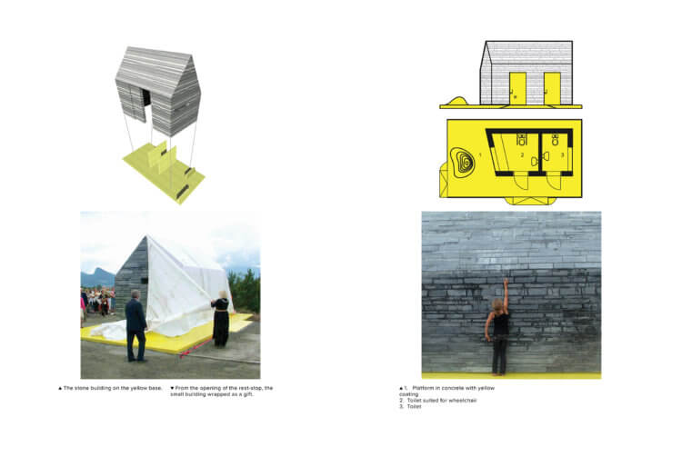 The platform with its sitting element and the inner walls and roof are made from concrete and coated with a bright yellow surface. The color helps to balance the heaviness off the building, brightening up the site on rainy days and has become part of the buildings identity.