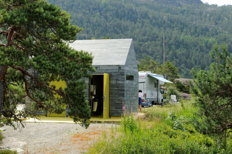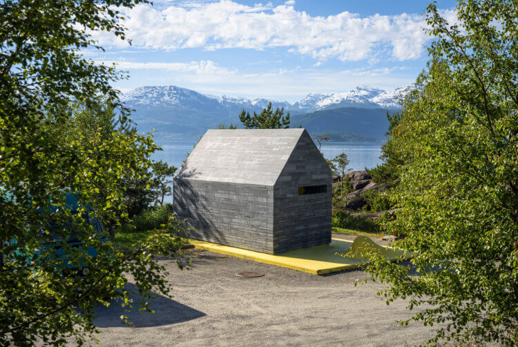 The rest stop at Hereiane is situated near the main road that leads along the hillsides of the Hardanger fjord, on the west coast of Norway. Beside the fjord-landscape the region is famous for its traditional architecture and hilly cherry- and apple orchards. Hereiane is located 20 minutes from Jondal on top of a big slope of massive rock, which leads all the way down to the water.