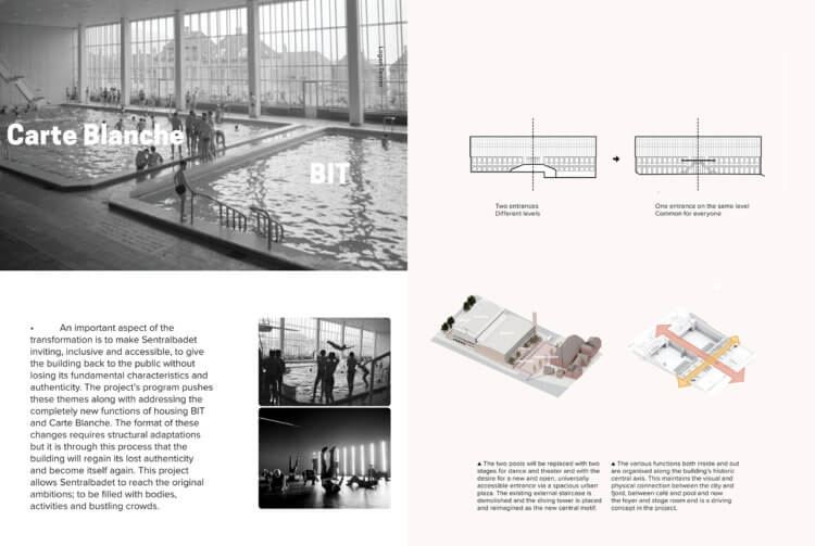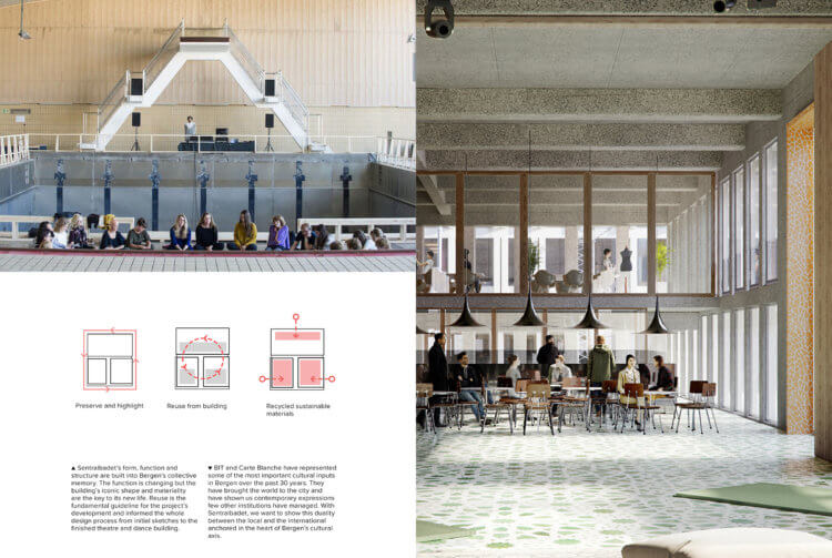 The transformation of Sentralbadet into a new performing arts center for bit and carte blanche is driven by the idea of renewal and protection trough use – enhancing the architectural and occupational qualities trough simple but active interventions for openness and transparency building and user alike.
