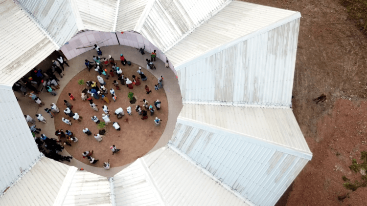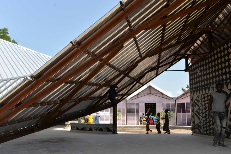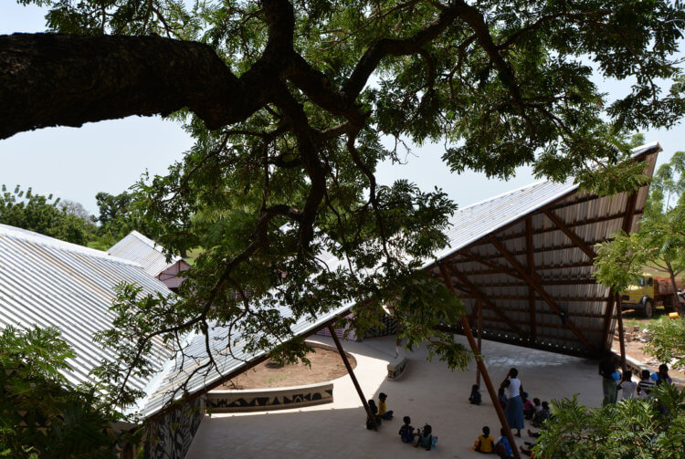 The roof is shaped like a folded piece of paper, gliding over the red soiled ground and giving shadow to a variety of rooms. A network of steel trusses supports the thin corrugated iron sheets, while solar panels feed the fans, insuring a good ventilation in the different rooms.