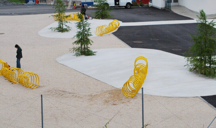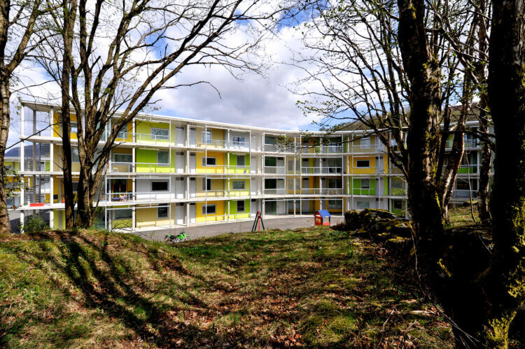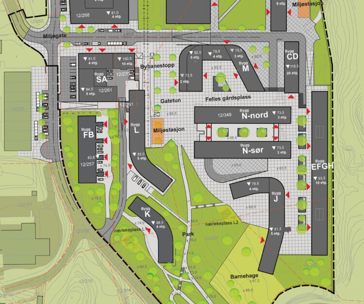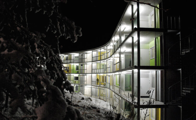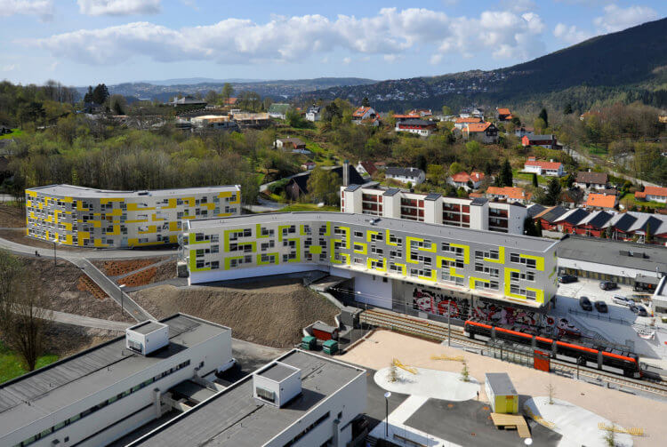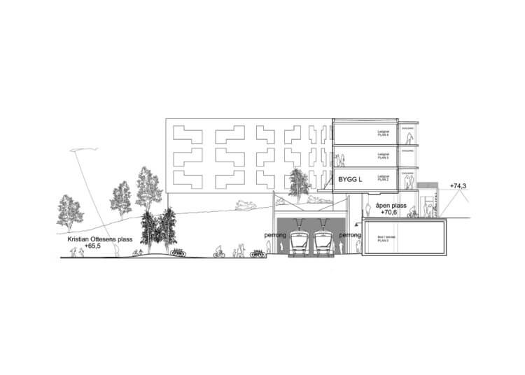 The ”Student City” at Fantoft, consists of five large residential blocks, built in typical sixties and seventies style. With 1344 units in all, including Bergen´s highest building, the area makes quite an impact at a local scale. The housing units are mainly ‘singles’, including only two family units. The two new slim, curved buildings contain 77 family apartments at single rows, enabling light and view at both sides. A common continuous balcony at each floor, constitute a social arena, as well as an outdoor space for the residents. The architecture reflects a clear contrast to the existing built mass, with bodies relating to the situation in a dynamic and active manner.
