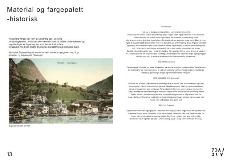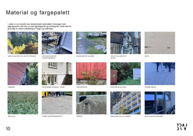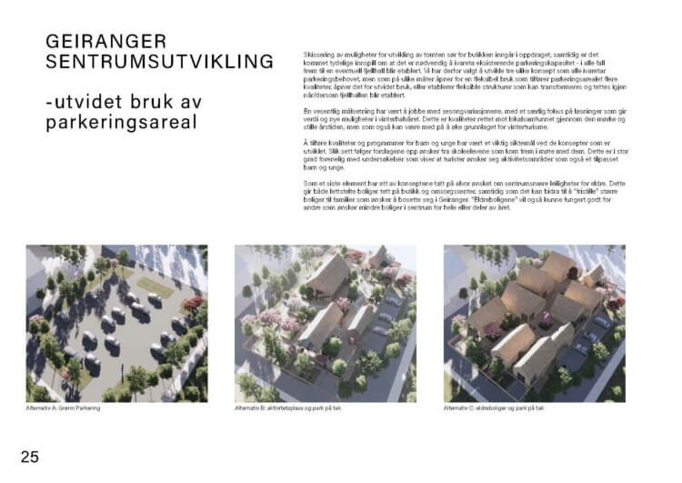 Sentrumsutvikling av Geiranger kan slik sett ikke knyttes til arkitektur- og bygderomskvaliteter eller funksjon alene, men må vurderes opp mot hvordan sammenhengene mellom de ulike elementene blir, og ikke minst hvordan dette tilpasser seg en natur med verdensarvstatus. Gjennom mulighetsstudiedelen av dette arbeidet er det utarbeidet en overordnet og strategisk plan for Geiranger sentrum. Planen er tuftet på analyser av stedet – både romlige analyser, analyser av verdier knyttet til kultur og natur, og sosiale analyser, i tillegg har det vært et stort fokus på trafikale utfordringer og parkering. Arealet som kan utvikles er begrenset. I tillegg til verdensarvstatusen ligger det føringer knyttet til naturfare, -verdier og kulturminner. Den overordnete planen for Geiranger sentrum