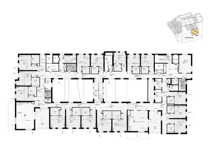 The healthcare centre will be built in 3 steps. In each step, a new building mass will replace an existing building and at the same time interact with preserved buildings. The first step comprises a caretake home, a treatment centre and a public outdoor space that will work as a natural meeting place in the town. The second step will be the main front desk, staff facilities, an activity centre, a nursing home and a daycare centre for the disabled, doctor’s offices, cafe and other amenities. The third step is a psychiatric center, family and children department, dental center and an additional care take homes.