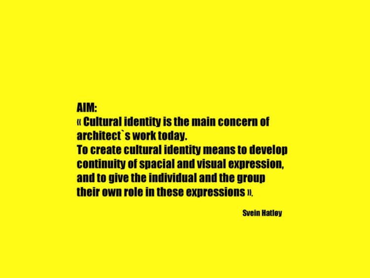 «Cultural identity is the main concern of architect`s work today. To create cultural identity means to develop continuity of special and visual expression, and to give the individual and the group their own role in these expressions.» Svein Hatløy